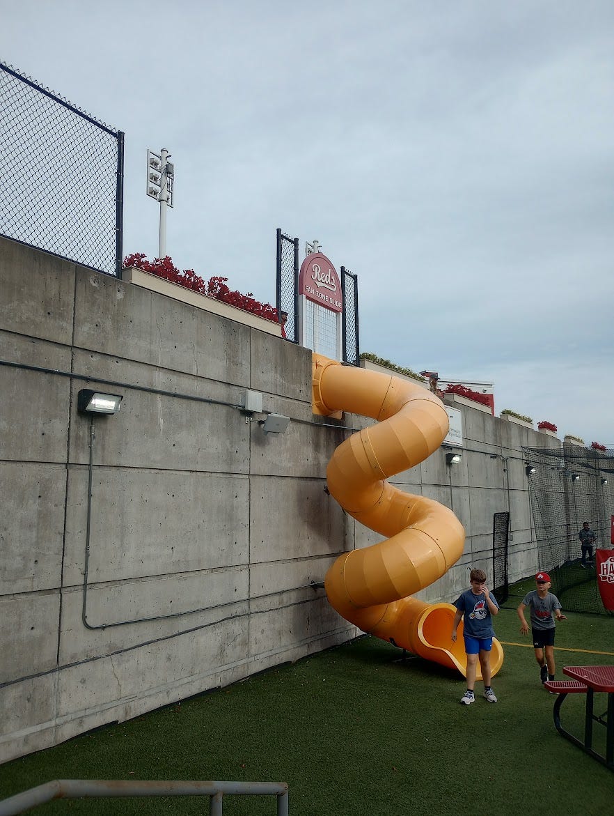 The riverboat themes throughout, the views, all top notch. Debated going for the all you can eat pass, a good deal, but we opted to let the girls pick what they wanted. One wanted a hotdog, and the other wanted Skyline, until I informed her: no pasta. So we went with LaRosa’s, which is fine pizza and all, but not exactly the baseball fare I had in mind. I grew up with “The Weiner The World Awaited” but prefer all beef hot dogs1, which I know the park has, but no offense to Kahn’s: not my first choice.