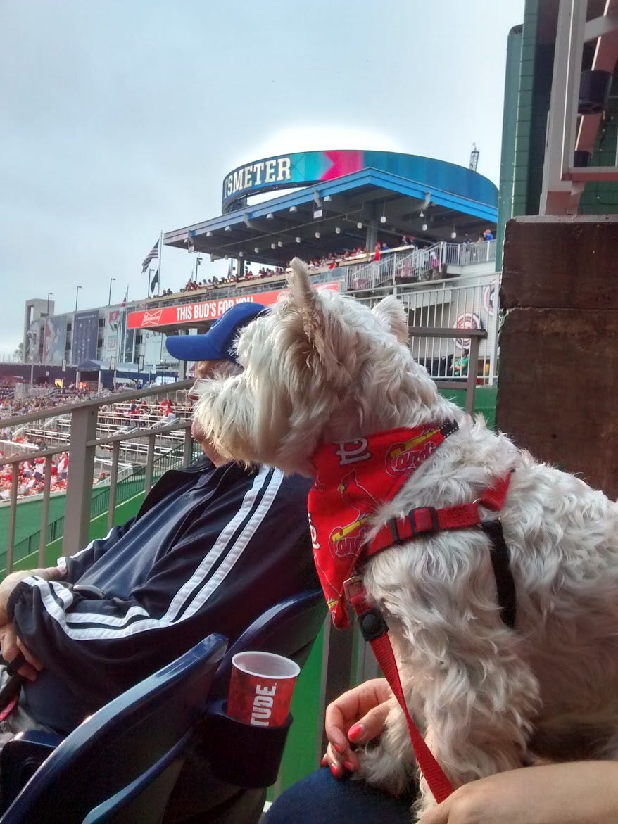 It was dog night at the ballpark, but our sweet boys were sequestered at home. The lone time we took Gus the Westie to Nats Park, it did not go well. He was hot, didn’t appreciate being so thoroughly leashed, and the noises? Not a fan! So there was no chance he was going to make it to tonight’s game. Rusty, my dog, well, we’re going to have to get that ball of energy trained if he’s going to ever make it to the Newtown dog park/bar or anywhere other than our backyard.